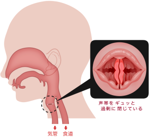 その結果、声帯がこすり合わせられ、硬い緊張した声に